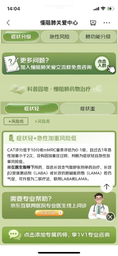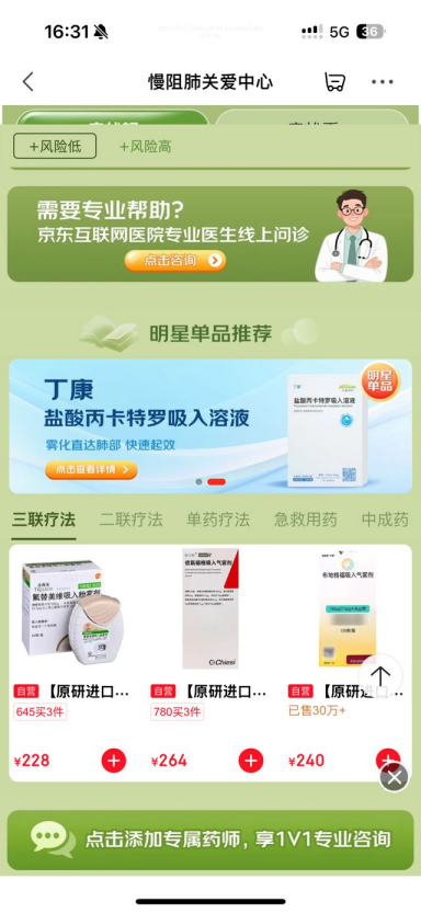 根据最新流行病学调查数据显示,我国慢阻肺患者人数接近1亿,其中40岁以上人群患病率达到13.7%,疾病负担相当沉重。面对这一严峻的公共卫生挑战,京东健康联合各合作品牌,构建覆盖科普、诊疗、康复全流程的慢阻肺健康管理服务体系。在药品供应保障方面,京东健康凭借全渠道覆盖的医药供应链,确保全再乐、丁康、泰尔畅等慢阻肺核心治疗药物的稳定供应。京东药师团队可为患者提供24小时实时在线的用药指导,帮助患者提升用药依从性,确保用药安全。同时,京东健康还与合作企业共同开展系列患者教育活动,通过专家直播、科普内容等形式,提升公众对慢阻肺的认知水平。