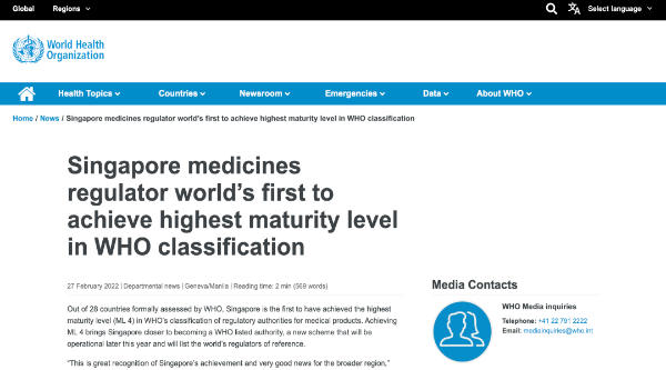 据了解,新加坡卫生科学局今年3月成为首个取得世界卫生组织最高评级(成熟度等级四)的国家监管机构。世卫组织自1997年开始对各国医药监管机构进行评估,评定标准涵盖整体监管体系、注册和上市许可、临床试验监督等,以保证监管工作的高标准、高质量和严谨性。