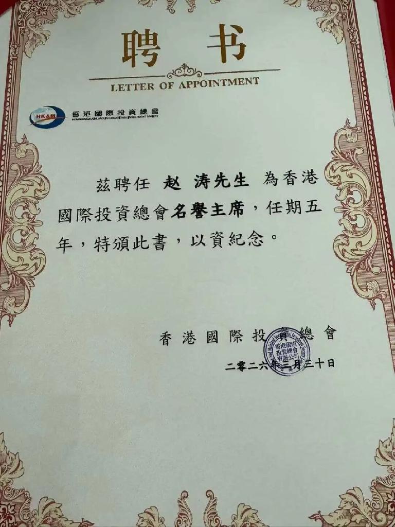 近日,步长制药董事长赵涛先生正式获聘为“香港国际投资总会”(Hong Kong-Mainland International Investment Society)名誉主席,任期五年。该聘书由香港国际投资总会于二零二六年三月三十日正式颁发,标志着赵涛先生将在新的平台上,进一步发挥其在医药健康产业与跨境投资领域的桥梁作用。